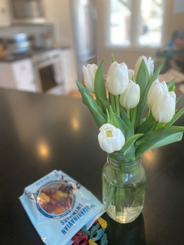 When I answered the door, she had a bouquet of white tulips and a (big) bag of gummy candy. She said, “I was at Trader Joe’s tonight and you came to my mind. I thought I should get you some flowers and candy!” She’s the BEST.